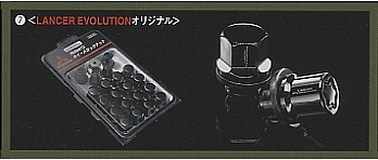 ●専用のダークシルバー色に加え、側面にLANCER EVOLUTIONロゴを刻印した専用仕様のロックナット(4個)とラグナット(16個)のセット。
